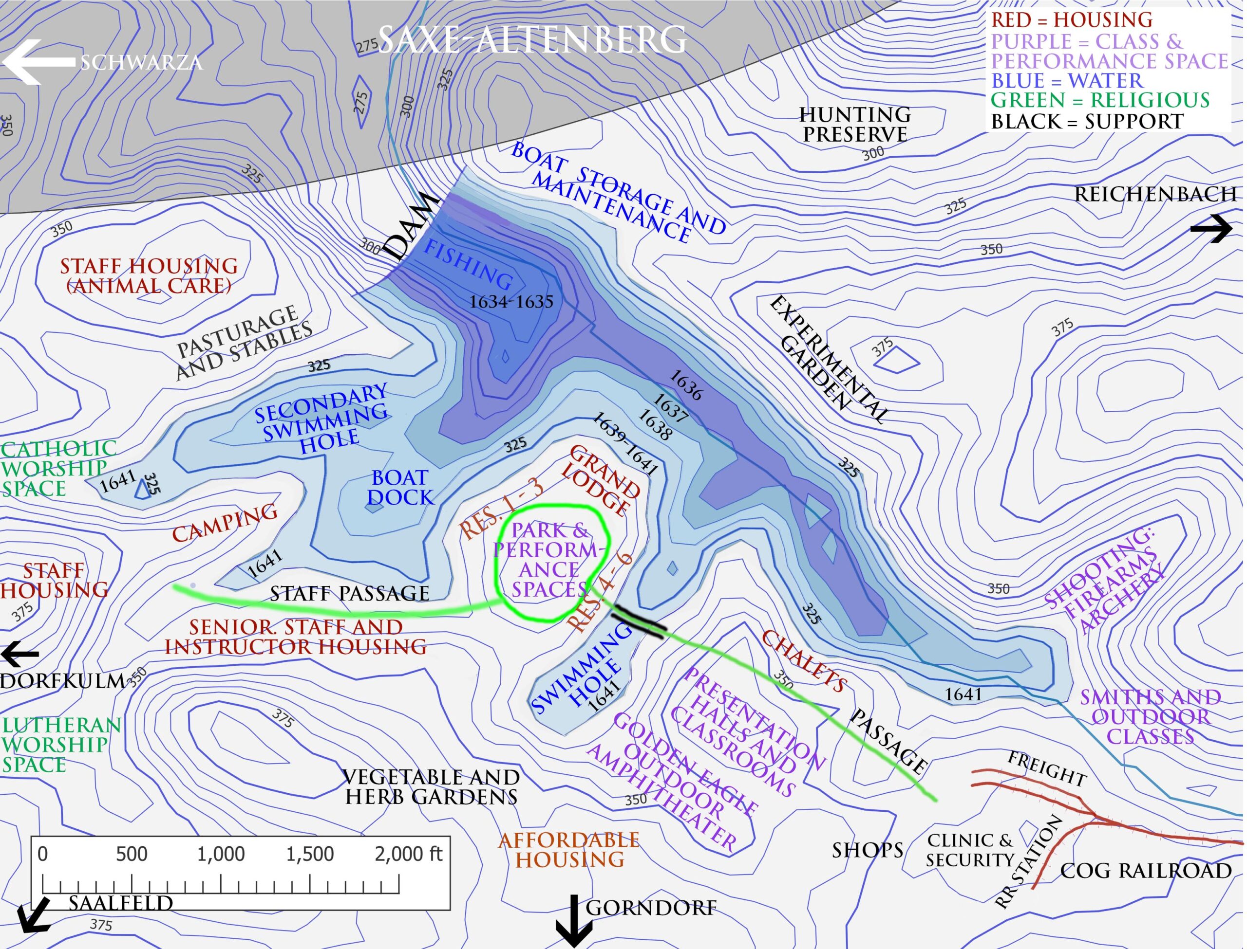 Redbird Institute is a down-time location inspired by the Chatauqua Institute. The primary location is between Dorfklum and Riechenbach. A dam is built and the flooded area creates a lake recreation area. This map (which replaces this map) shows the rough layout of the area. Please note that you can see the topographical lines under the water as well, which means you can see where water is shallower and where there are steeper drop offs.