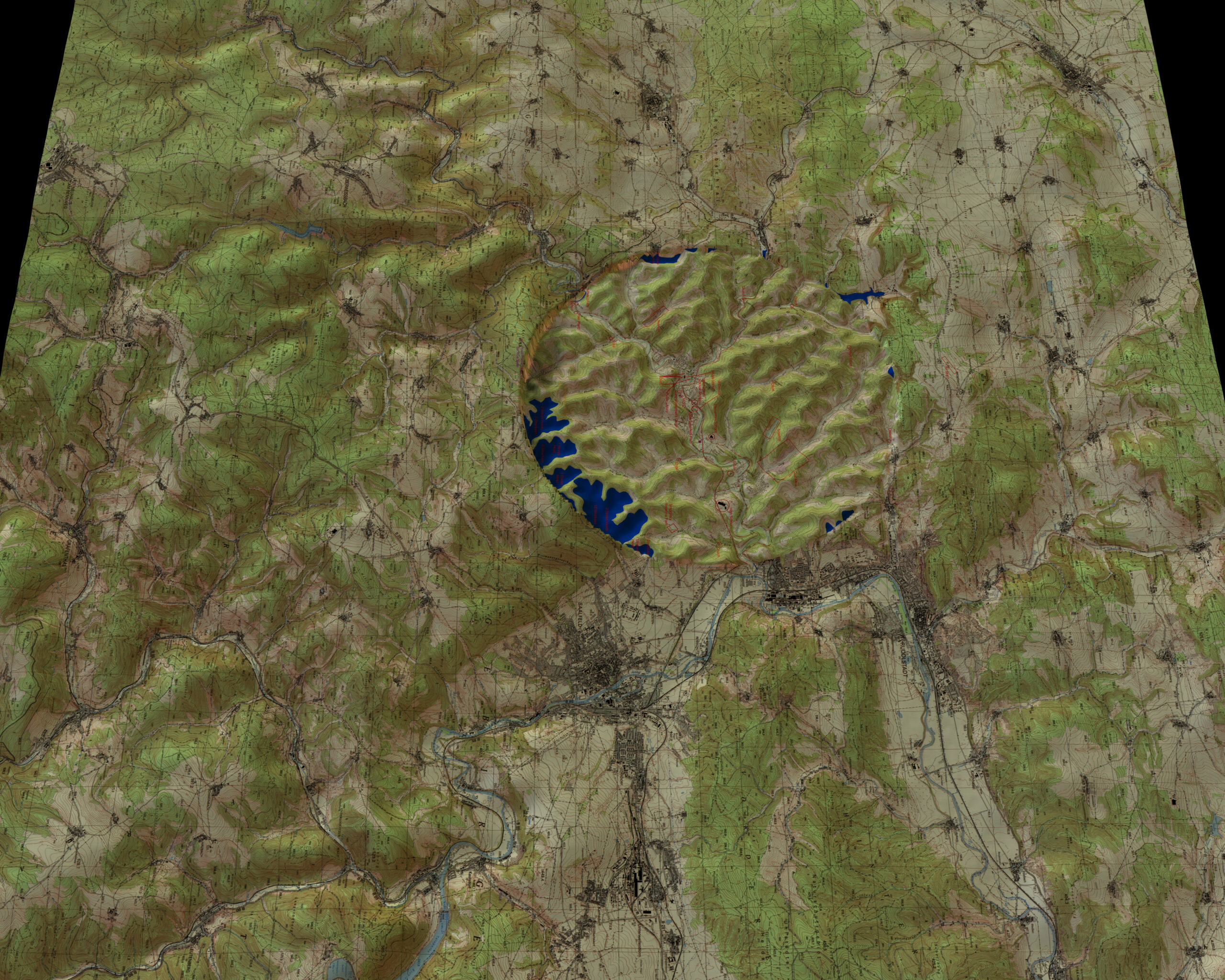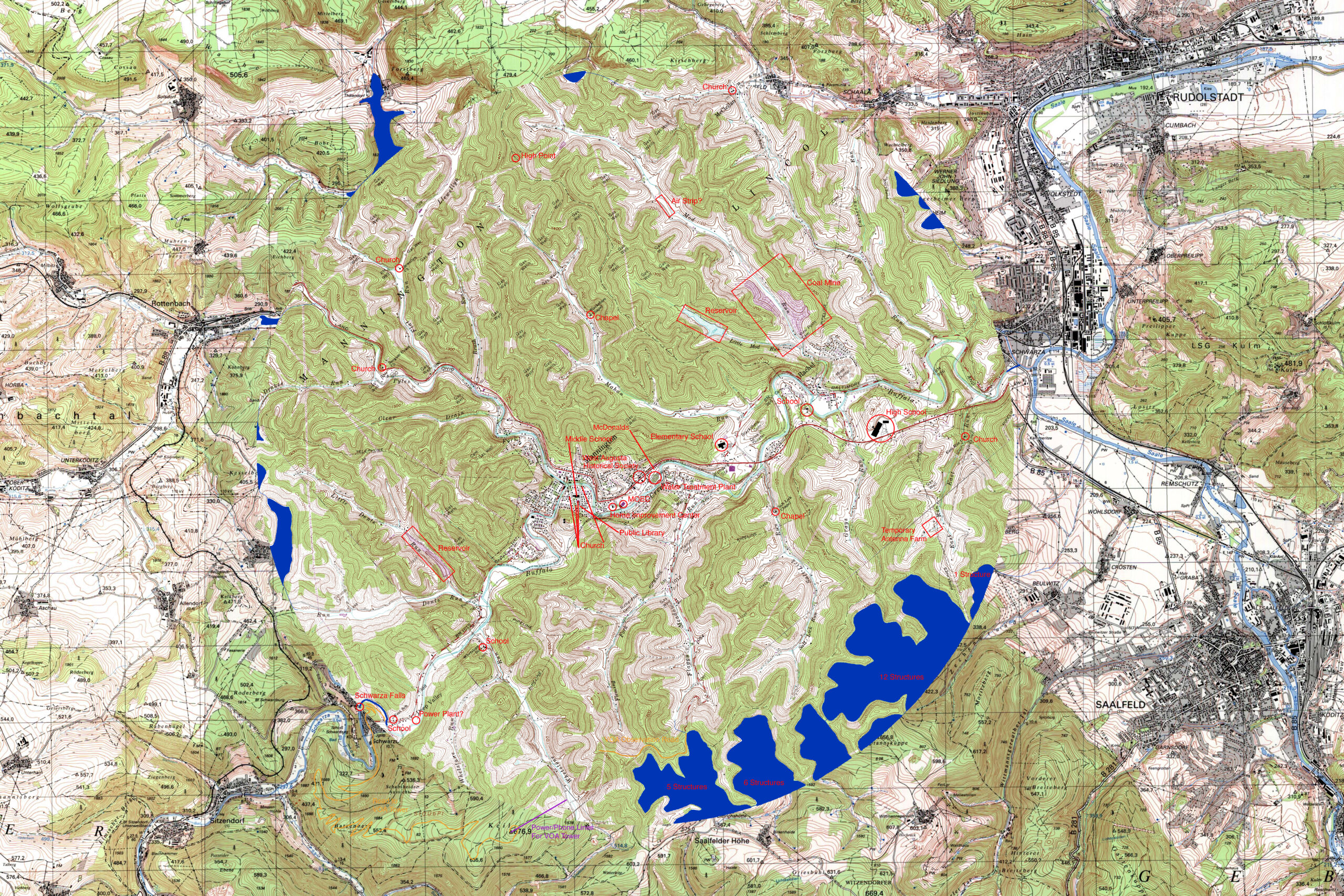 The first two sets of maps have changes to the maps which are not a part of the original USGS or German maps. The elementary and high schools have been manually drawn into the maps. A rail line has been added to the power plant. The significant change is that a hill was cut-through to allow for a reasonable grade. If the power plant isn’t where I speculate then the rail line will be removed. (This is easy.) The oil wells have been removed and so have the oil pumping stations because Eric says they aren’t there.